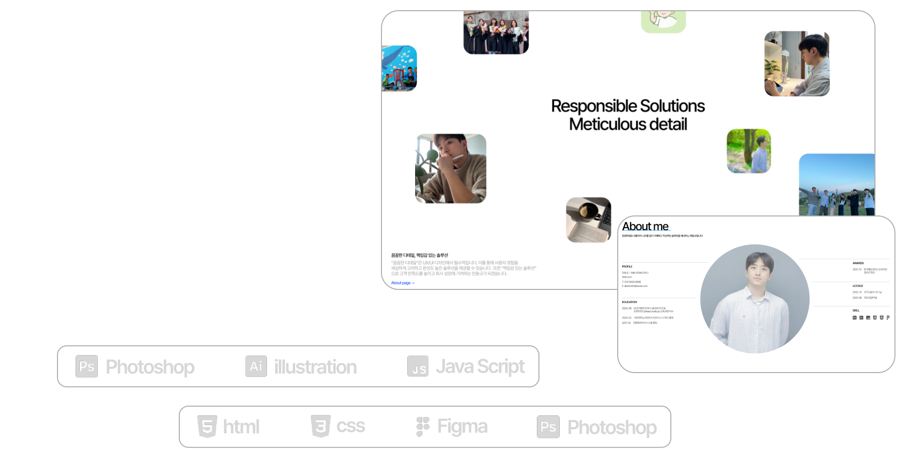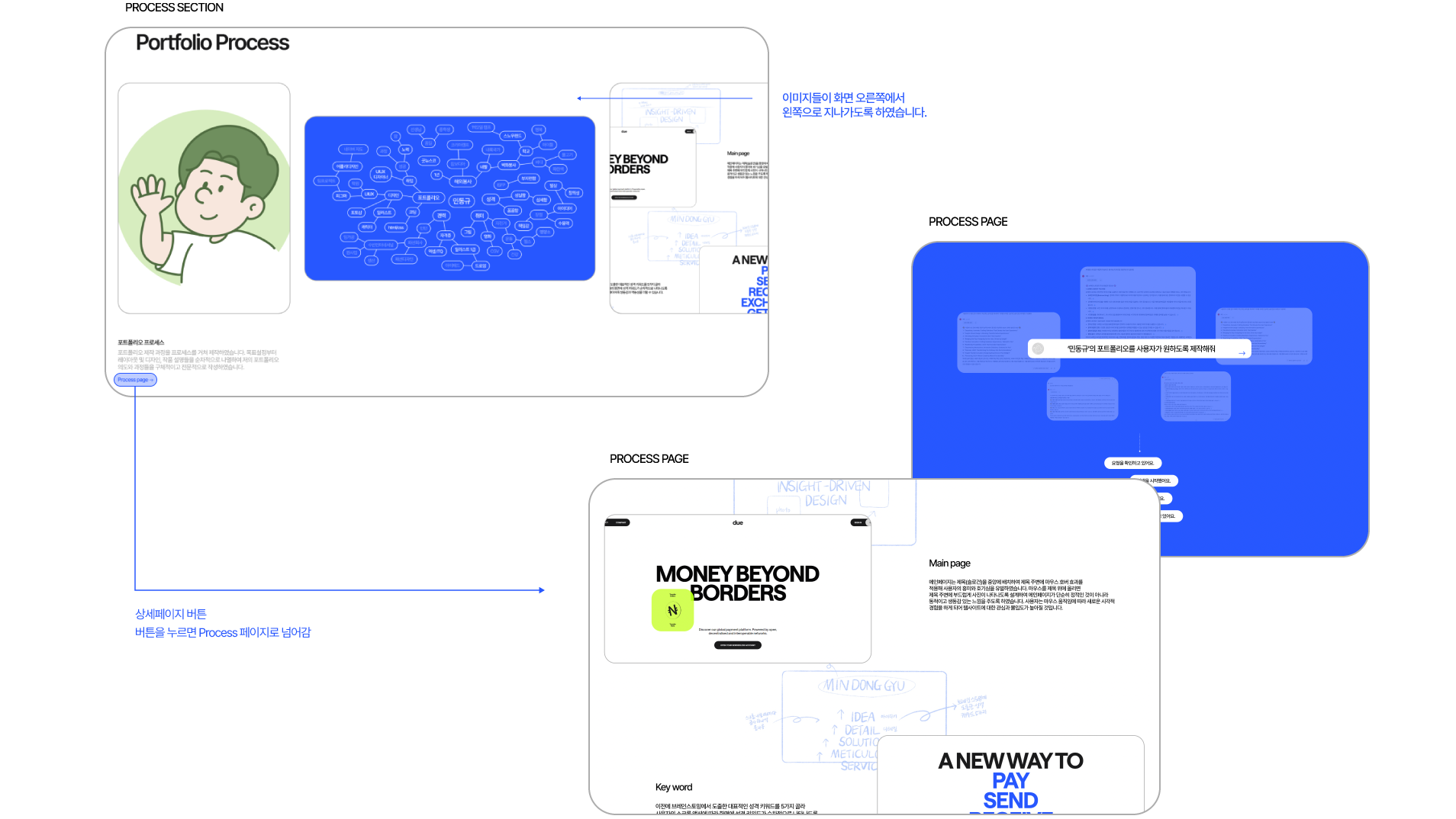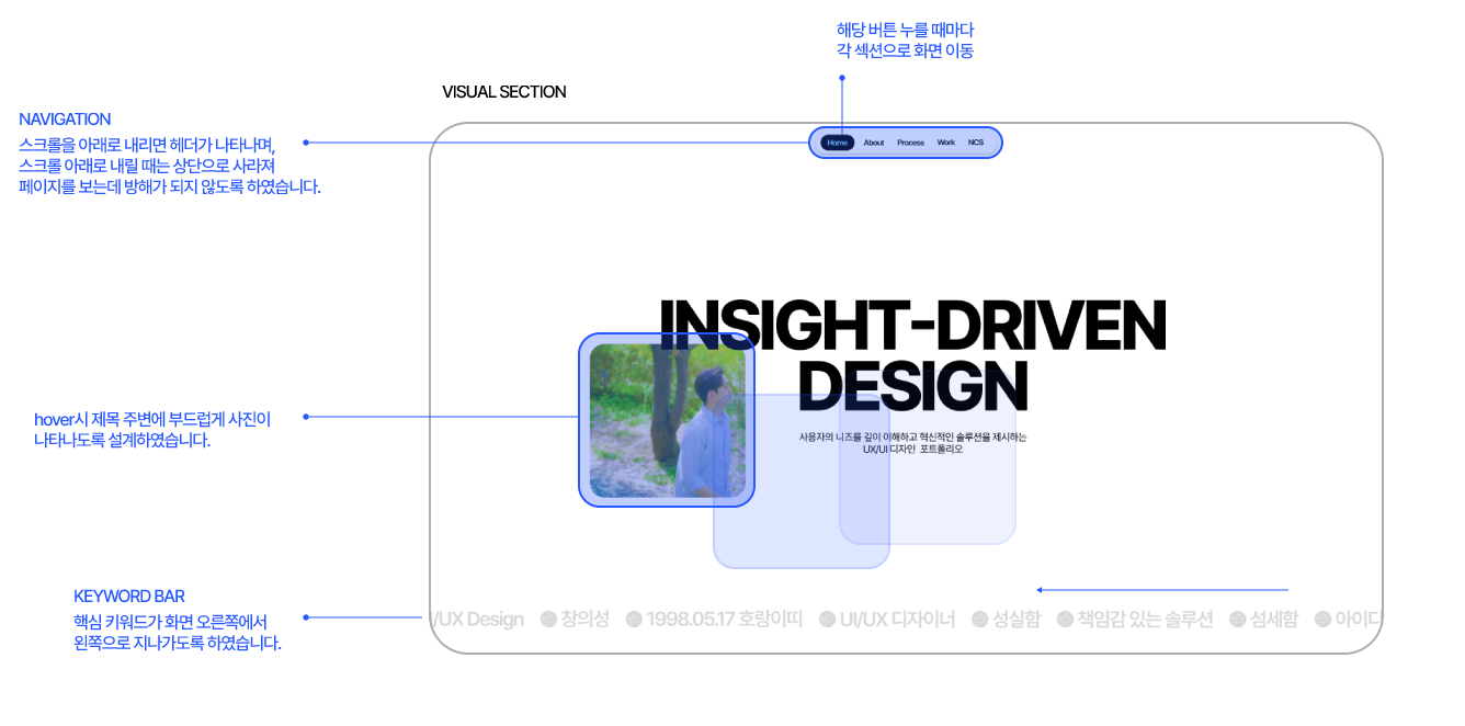 제목 주변에 부드럽게 사진이 나타나도록 설계하여 메인페이지가 단순히 정적인